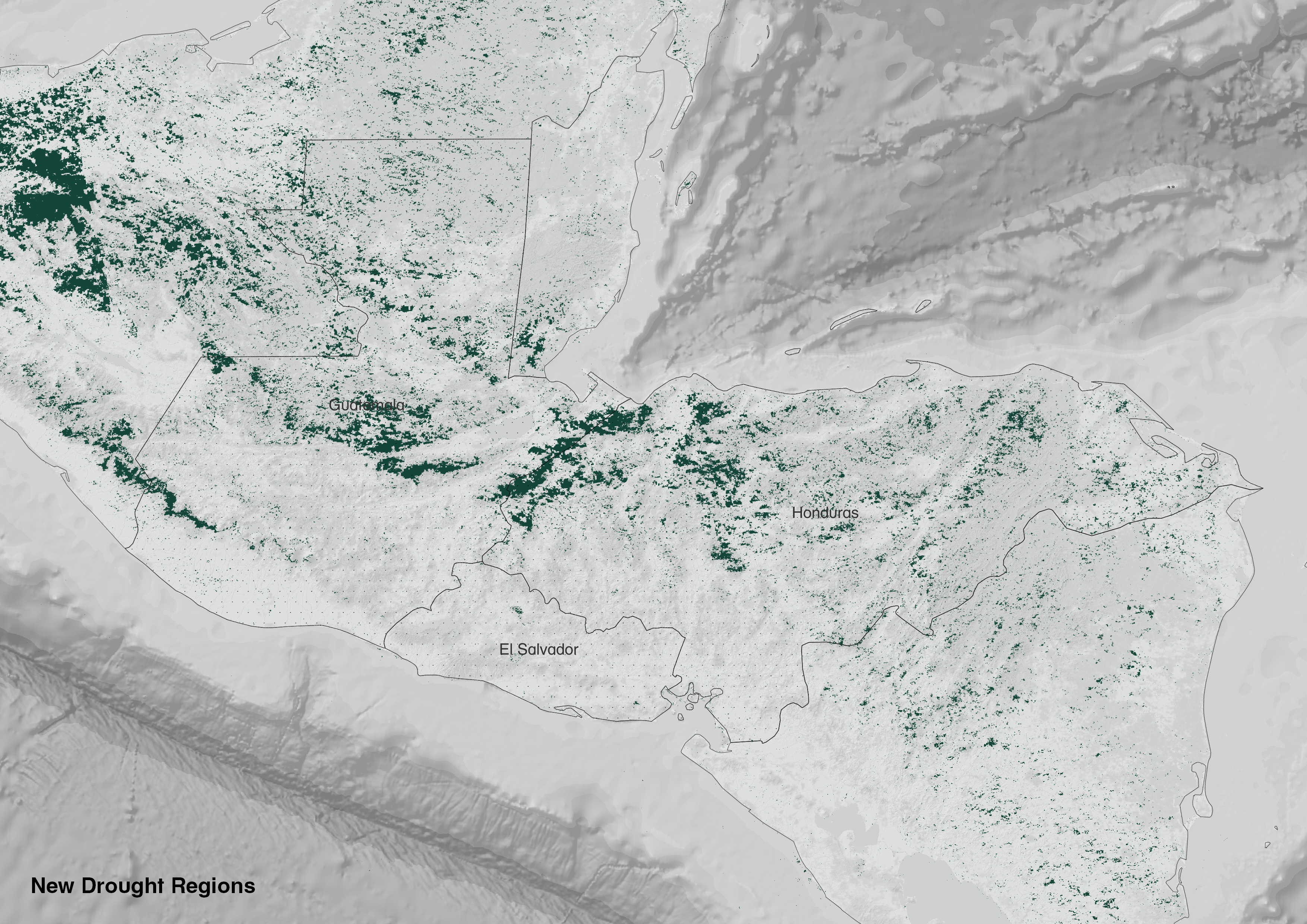 The map shows the new drought regions in the Northern Triangle in the last five years. Data Source: ARCGIS Increased_Drought_Regions (Map Service)