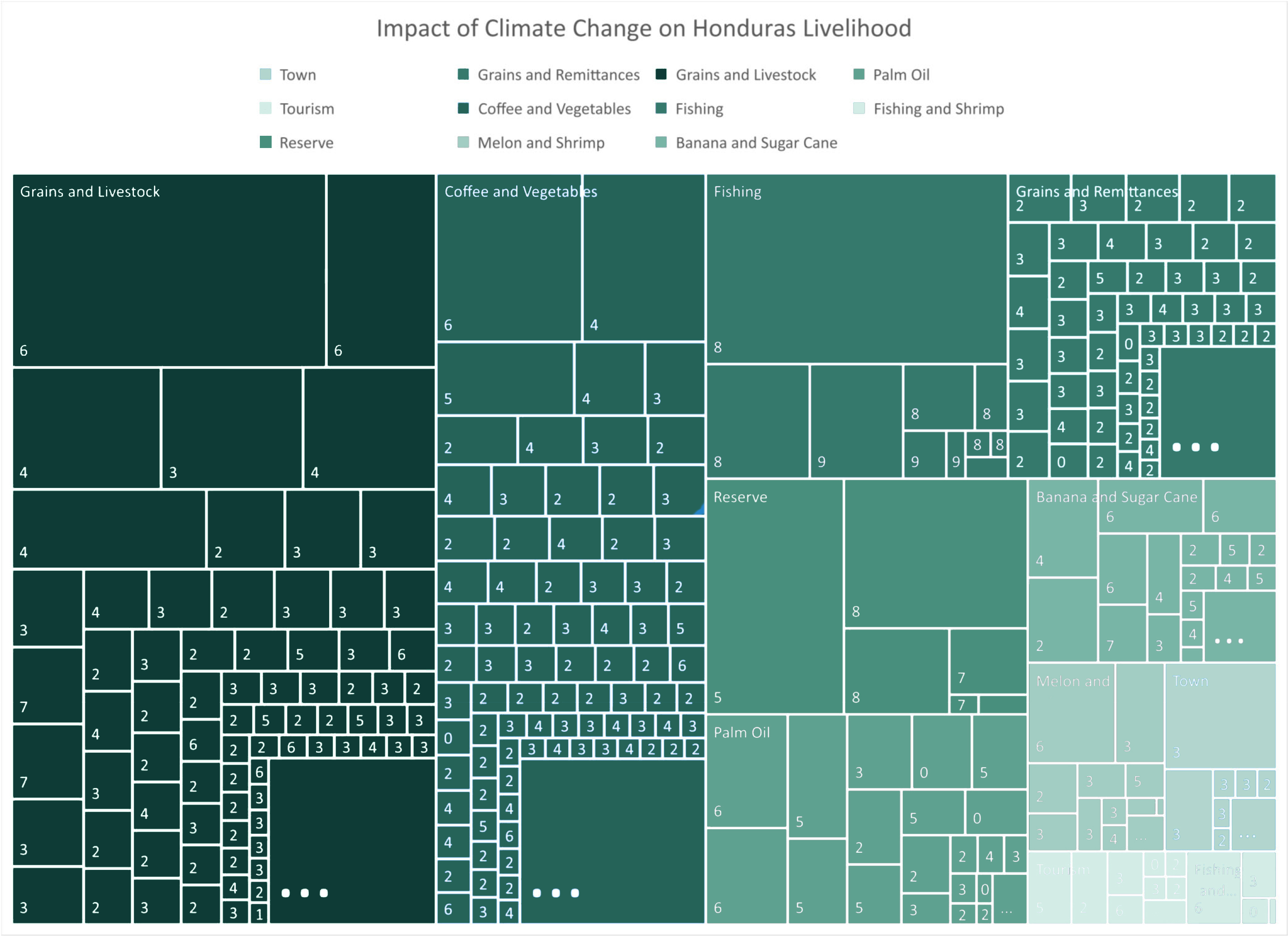 According to Famine Early Warning Systems Network (FEWS NET), Honduras has 11 major livelihood sources. The diagram illustrates the impact of climate change on Livelihood Zones in Honduras by area. The reading of visualization by area reveals that harvesting grains, livestock, coffee and horticulture are widely practiced followed by fishing, palm oil and so on. Although fishing has a moderate dependency on livelihood, it is largely impacted by changing climate, followed by cultivation of grains and coffee.